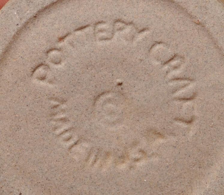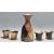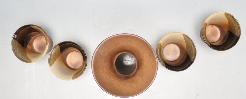 A vintage retro 1970s mid century American studio 'Pottery Craft' wine set designed  Robert Maxwell. The set includes a carafe with raised 'Vino' stamp to the body and four beaker cups. All pieces have a  sectional design of alternative glazes.  Marked 'Pottery Craft Made In USA' to the base. Carafe measures 25cm tall.