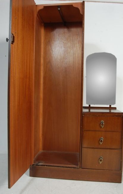 A post war 1950’s wardrobe combination. The oak veneer body comprising an upright sentry box wardrobe with chest of drawers to the side. Finished with brass effect pull handles.  Measures, 170 cm H x 90 cm W x 45 cm D