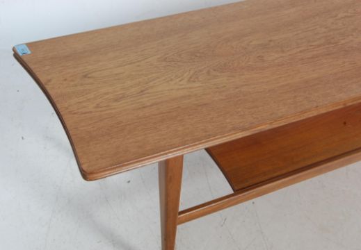A retro vintage 1970s teak wood long john coffee table of rectangular form with curved ends raised on angular tapering legs united by a magazine rack.Measures, 35 cm H x 120 cm W x 41 cm D