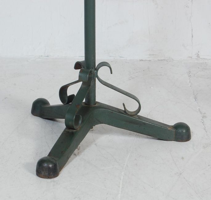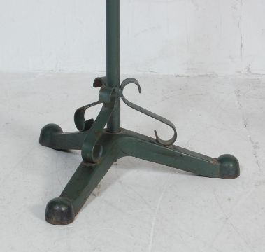 Two 20th Century cast metal garden jardinière plant stands to include a green painted example having a central column raised on three legs, and a gilt example with scrolled metal work supported by four support with finial tops.