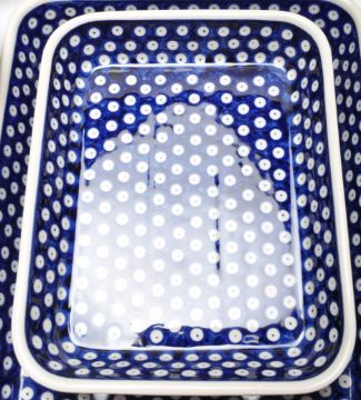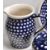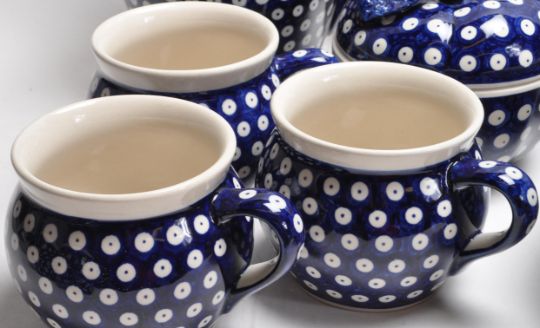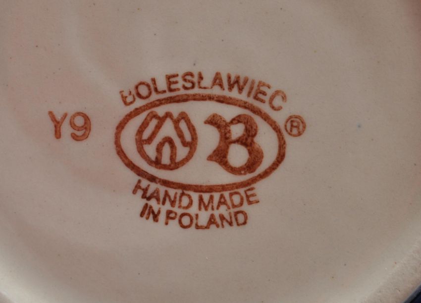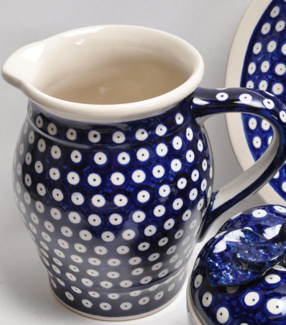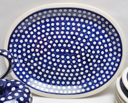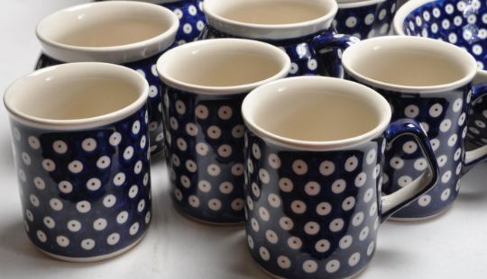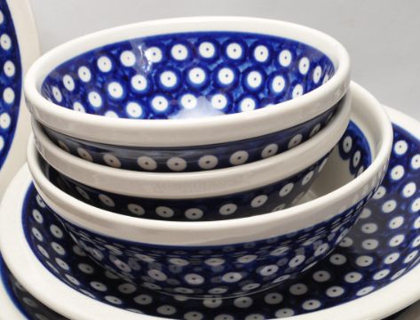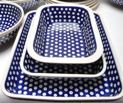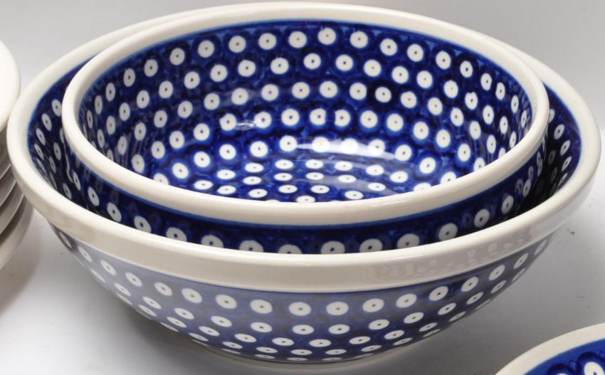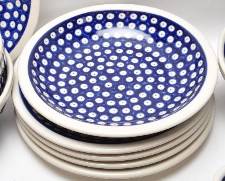 A large collection of vintage 20th century Boleslawiec Polish art pottery tableware to include plates, bowls, serving dishes, mugs, jugs, etc. All hand painted and hand made. 5cm x 32cm x 26cm