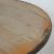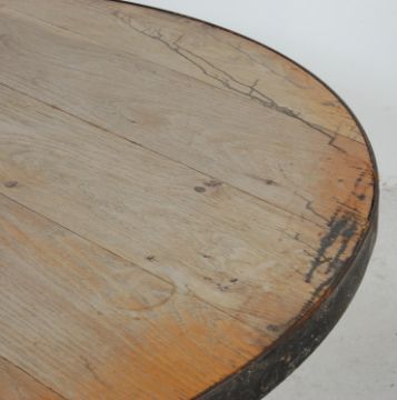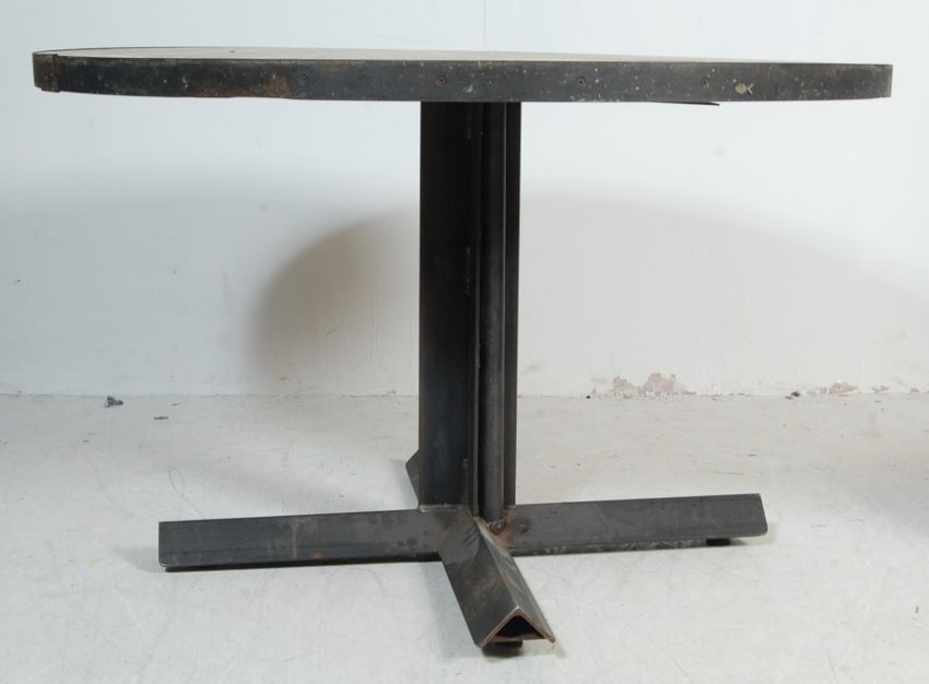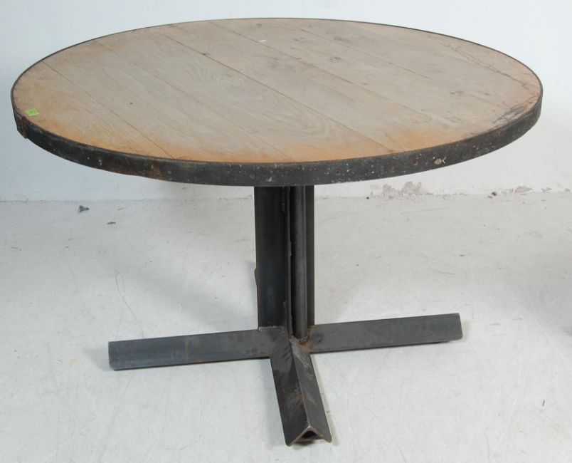 A vintage style factory industrial handmade refectory metal steel frame dining table of a circular form having rustic wooden top with metal banding to the edges raised on splayed legs. H75cm x W120cm diameter