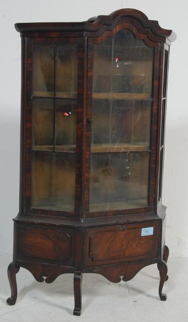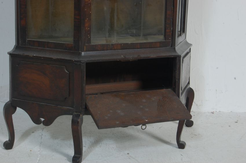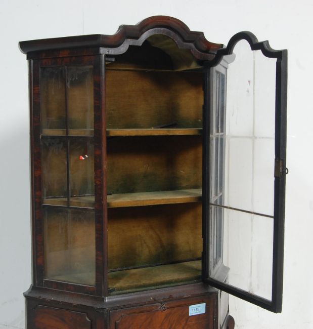 An antique style Georgian revival apprentice piece / table top bookcase cabinet vitrine having a cornice over an astragal glazed front opening to reveal a shelved interior raised on cabriole legs.  Measures,  77 cm H x 50 cm W x 44 cm D