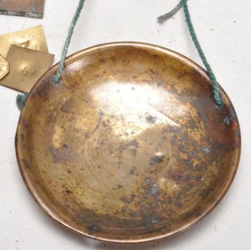 A late 19th early 20th century set of brass opium / apothecary scales having a horizontal beam and two weighing pans. Comes with own weights and box. 3cm x 19cm x 8cm