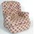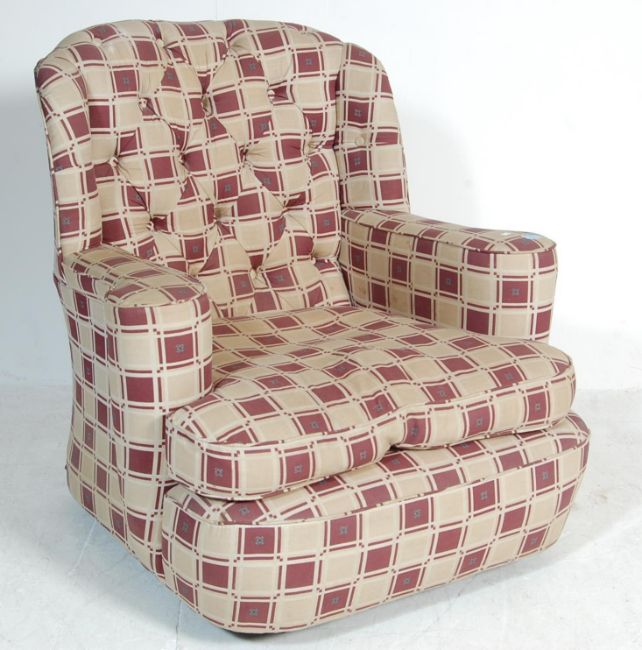 A Howard style late 20th century wing back arm chair / fireside chair having a chesterfield style backrest with shaped elbow rests with red and cream checked fabric raised on wheels.Measures 94 cm H x 80 cm W x 70 cm D
