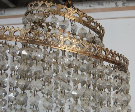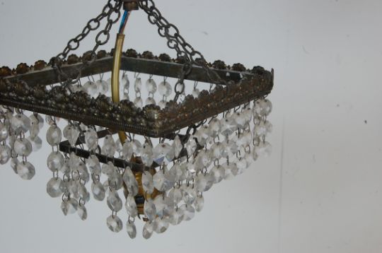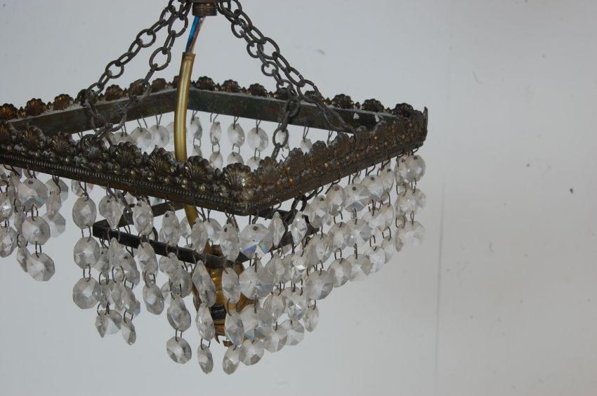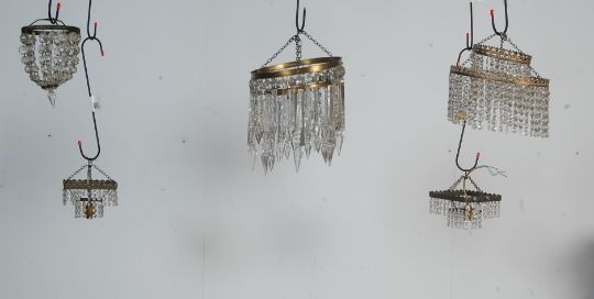 A collection of three early 20th century Empire style chandeliers / electroliers of various shapes all having brass frames with faceted drop glass adornments. Measures 27 cm H x 25 Diameter