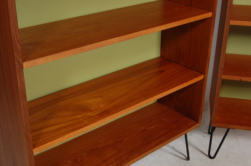 Two vintage 1970’s G Plan teak wood open window bookcase cabinets having adjustable shelves with opened top, all raised on black metal hairpin legs.Measures, 150 cm H x 84 cm W x 27 cm D