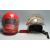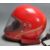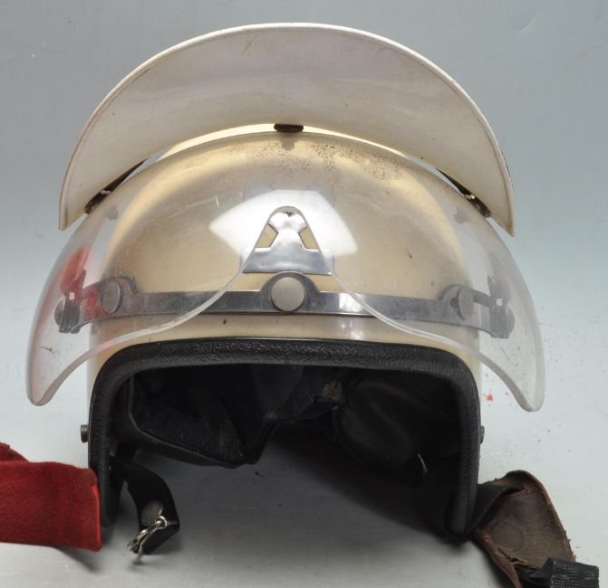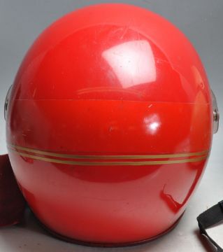 Two vintage retro 20th century motorcycle / motorbike helmet. A red Bob Heath helmets with clear visor and red liner along with an original Stadium motorcycle helmet with clear face shield visor and original liner.