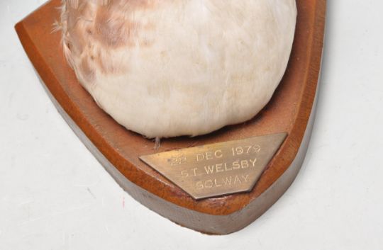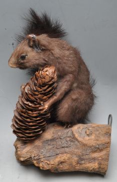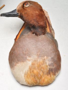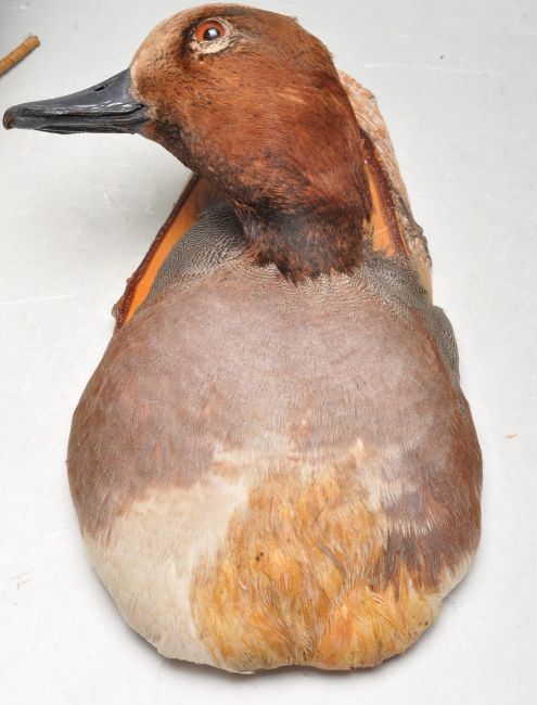 Of Taxidermy interest - A collection of late 20th century taxidermy to include a plaque mounted ducks head, a ducks head mounted to a log, a polystyrene model hen with feathers, a squirrel on a log holding a pine cone and another bird mounted on a naturalistic base. Measures 18cm tall.