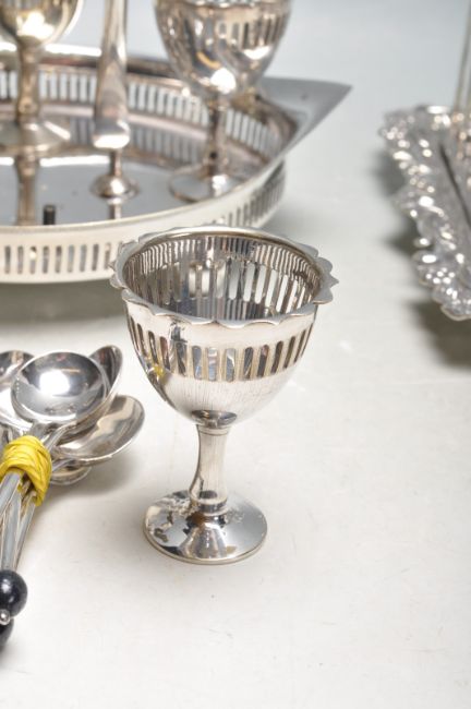 A collection of early 20th century silver plated table ware to include toast rack, egg golden, condiments pots, etc. Along with a set of four silver spoons hallmarked London dated 1922 by Josiah Williams & Co (David Landsborough Fullerton)