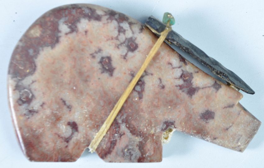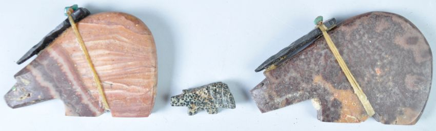 A collection of Native American Zuni hand carved stone fetishes / stone fetish figures. Two in the form of bears with arrow heads to top along with a smaller carved example. Measures: 8cm x 5cm, 7cm x 4.5cm and 3cm.