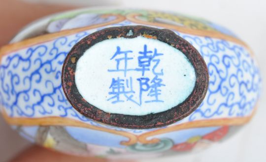 A 19th Century Chinese antique porcelain Qianlong mark snuff bottle vase with hand painted decoration depicting seated mother & child to both sides with blue scrolled decoration. Stopper to top. Painted four character Qianlong mark to underside.