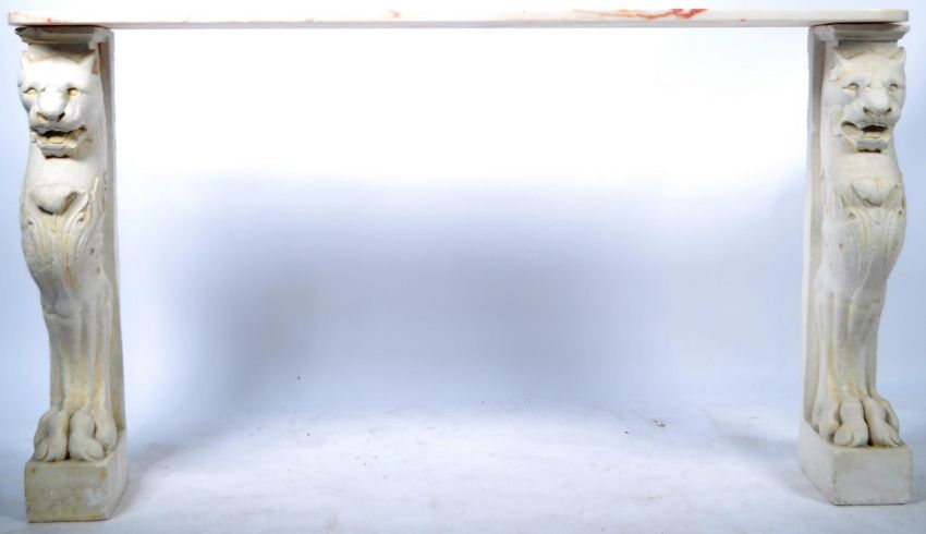 An impressive 20th Century antique style marble and plaster console table / side table or hall table having a white and pink veined marble top with two mythical griffin columns supporting the top, White painted with detailed features. A great statement piece. Measures approx 84cm x 150cm x 30cm.