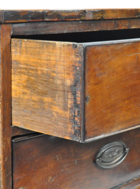 A late 18th Century Georgian mahogany and satinwood bow front chest of drawers. The bow fronted bank of two over three drawers having brass armorial lock plates and oval handles with swing handles. All raised on shaped bracket feet. Measures approx; 103cm x 103cm x 52cm.