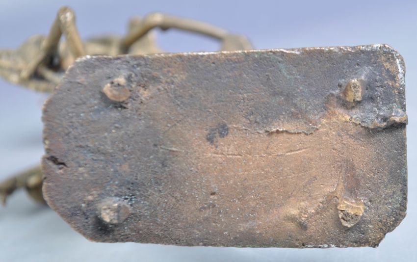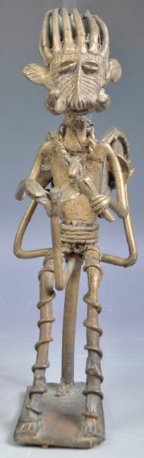 An antique 19th Century Indian Tribal Bastar Tribe Dhokra lost wax method bronze figure depicting a winged figure seated with animalistic mask and long spiked horns to top and tusks to face. Measures approx; 21cm tall