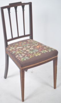 An antique 19th Century Georgian mahogany and tapestry dining / side hall chair having a decorative carved backrest with floral detailing. Floral tapestry scene to the seat rest with animals interspersed all on brown ground. Raised on a tapering square supports. Measures approx 83cm x 43cm x 41cm.