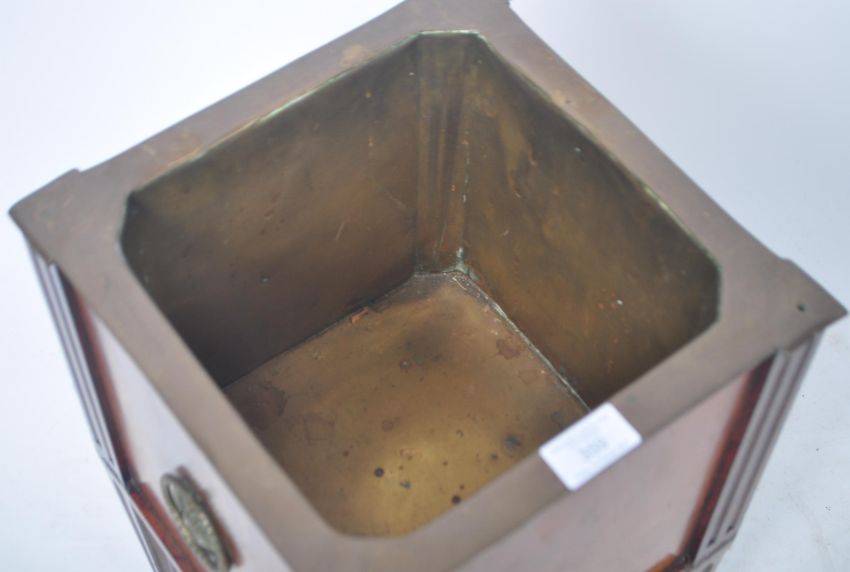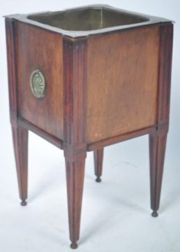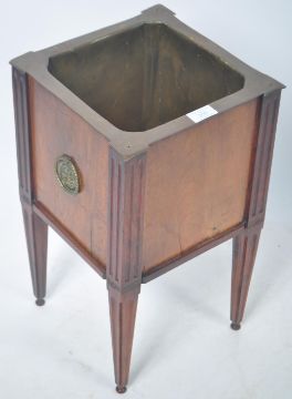 An antique 19th Century walnut wine champagne ice bucket of simple square form having an inset metal tray with overing top. Decorative brass hoop swing handles to the exterior with floral worked backplates with all being raised on straight tapered reeded legs. Measures approx 48cm x 28cm x 28cm.