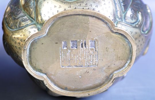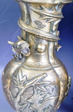A decorative pair of antique 19th Century Chinese Oriental heavy bronze vases with each having flared rims with cast dragon chasing the flaming pearl decoration to the waisted necks. Bulbous bodies below with further engraved and repousse decoration depicting cranes and deers amongst woodlands. Each raised lozenges shaped base. Six character Zhaunshu Seal Script mark to bases. Each measures approx 25cm x 14cm x 12cm. Repair to rim.