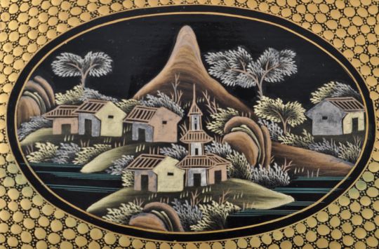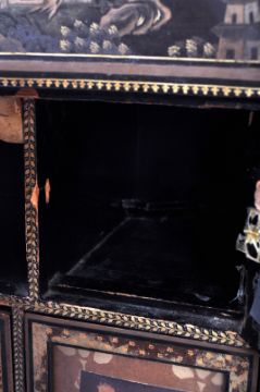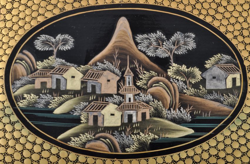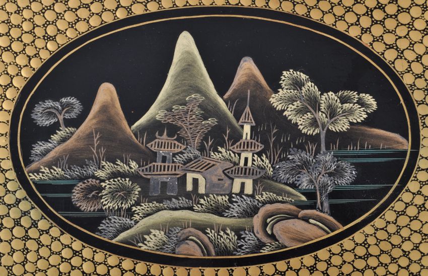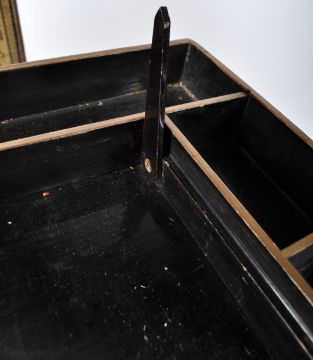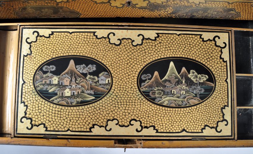 An antique early 19th Century Chinese Oriental Chinoiserie black lacquer cabinet on stand. Comprises of a twin door cabinet top with fully appointed interior and carved pediment top with twin section open top box raised on a square table stand all raised on tapering square legs. Hand painted gilt decoration with scenes of buildings and decorative borders. Dismantles into three sections for ease of transport. AF condition. Measures approx 130cm x 55cm x 53cm.