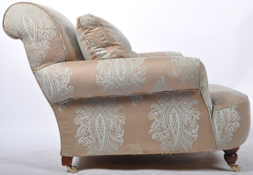 A 19th Century Victorian Howard style armchair lounge arm chair / easy chair having a superb embroidered silk Damask upholsery with scrolls and leaves. Shaped cushioned backrest with broad curved barrel arms, sprung and straw filled seat complete with matching cushion. Raised on turned front legs with brass castors. Measures approx: 80cm x 90cm x 110cm.