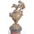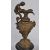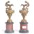 A pair of 19th Century French antique bronze classical urns having a figural scrolled handle and rams head mask. The body decorated in relief with bears lions and birds. Raised on stepped black and red marble pedestal base. Measures: 31cm.