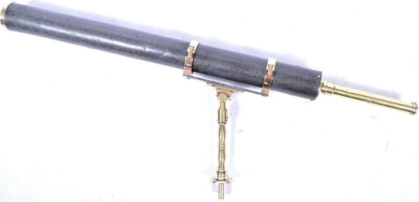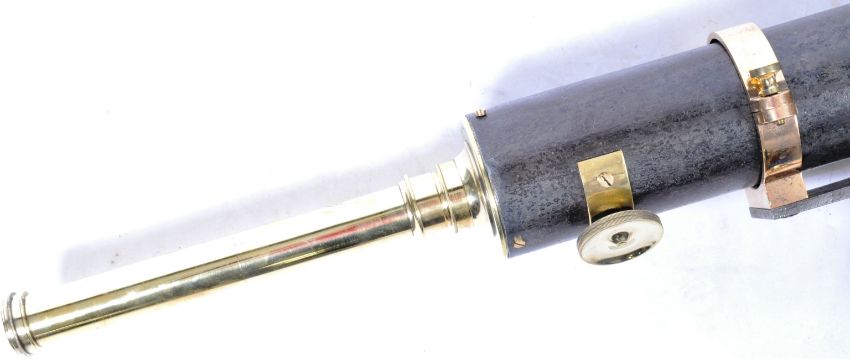 A large and impressive 19th Century brass and steel cased naval telescope - likely a harbourmasters or lighthouse keeper example. The scope having a long tubular body with adjuster to side and single drawer eyepiece looking lens. Raised on a adjustable brass stem. London makes mark. Hairline crack to one lens. Measures approx when closed 123cm long.