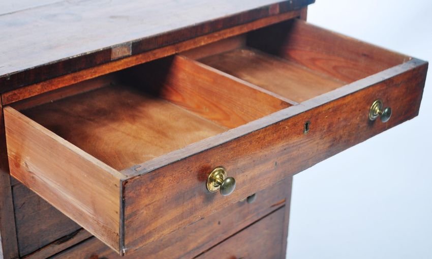 An antique 18th Century Georgian mahogany bachelor's chest of drawers of smaller proportions. The straight bank of four drawers having turned brass handles to the drawer fronts. Front to back pine drawer linings and all raised on bracket feet. Measures approx: 71cm x 68cm x 43cm.