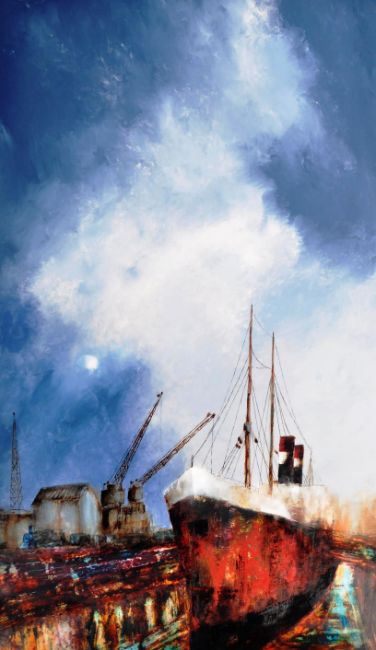 David Chambers (1946-present) - English Artist - A large and impressive oil on board seascape painting depicting 20th Century moored shipping boat along Bristol docks with buildings and cranes to the verso. Signed by the artist to the lower left. Set within a silverard frame. Overall size measures approx 128cm x 85cm.