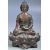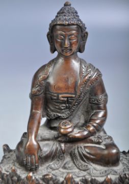 An antique 19th Century Chinese bronze figurine of Buddha. The highly detailed example having beaded headdress and scrolled robes holding a prayer bot in one hand and the other resting in knee. Modelled in the Lotus position and raised on a pedestal base. Later added copper panel to base securing something within. A good period example. Measures approx; 11cm tall.