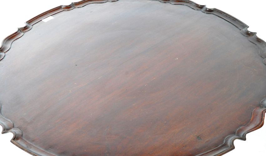 An antique late 18th / 19th Century English mahogany wine table / side occasional table having a ' Pie Crust ' edge top with tilt top action raised on turned reeded column over tripod carved cabriole leg with ball and claw foot. Measures approx 71cm X 84cm diameter.