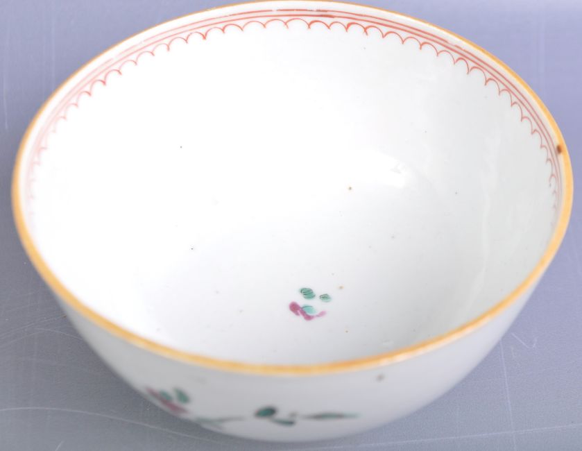 An antique 18th Century Chinese Oriental porcelain bowl having hand painted Wucai enamel decoration with exterior scene, floral sprays and leaves. The internal rim having a repeating geometric pattern in orcher. Raised on a small circular foot. Measures approx; 11cm wide. Condition; one hairline to rim but overall good.