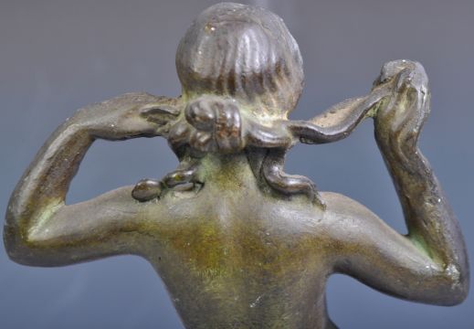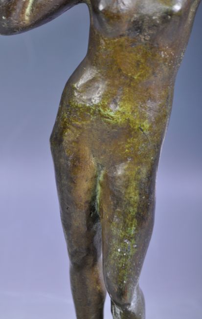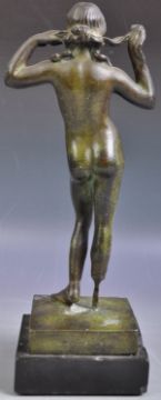 A believed antique 17th / 18th Century Roman bronze figurine statue figure depicting Venus or other female Deity God. Modeled nude with hands raised playing with hair. The figure cast with one leg raised on a bronze square plinth over a square marble base. Measures approx; 29cm tall.