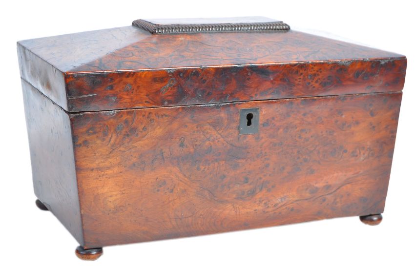An early 19th Century Georgian Regency English antique burr walnut tea caddy of sarcophagus form. The outer case having gadrooned top section and raised on bun feet with brass lock escutcheon. The hinged lid opening to reveal a fully appointed interior with central glass mixing well flanked by two lidded tea caddy sections. Measures:  17cm x 30cm x 15cm.