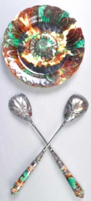 A good pair of antique 19th Century Victorian English Wedgwood Majolica pottery and silver plated serving spoons. Each server having plated embossed floral ends with majolica handles with silverplated bands. Together with an antique Wedgwood Sunflower design plate having a mottled tortoiseshell patterned glaze finish plate having a scalloped rim. Serving spoons measure approx 33cm long. Plate measures 22cm diameter.