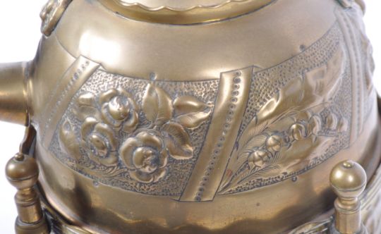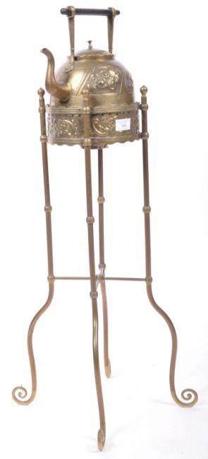 A charming antique 19th Century Victorian Aesthetic movement brass kettle on stand. Comprises a detailed kettle with wooden ebonised handle atop decorated with stylised panels of flowers and classical face masks. Raised on a tubular scroll burner stand with 'x' stretcher and ball finials. Measures approx: 83cm tall