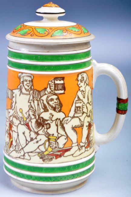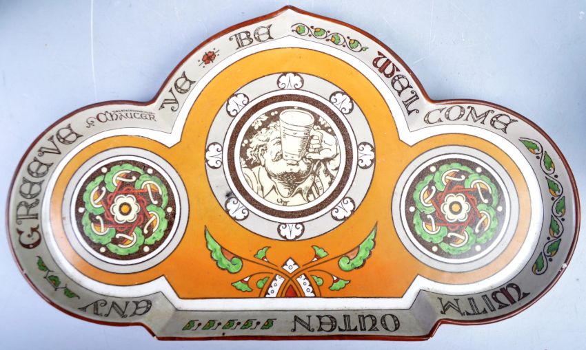 A 19th Century Mintons Dr Christopher Dresser period twin tankard and tray set. Each piece decorated with medieval figures and notation. Tray measures: 38cm wide.