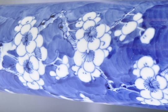 An antique 19th Century Chinese Kangxi mark porcelain sleeve vase of tall cylindrical form hand painted in the Prunus pattern. Deep blue ground with blossoming floral branches. Four character Kangxi mark to base in Kaishu script. Measures approx; 30cm tall. Conditions; Professional repair to rim and fracture to base.