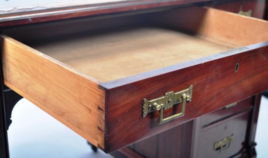 An antique 19th Century Victorian English mahogany twin pedestal writing table desk of good proportions in the manner of James Shoolbred & Co. Comprises a black gilt tooled leather writing skiver with central drawer above the knee hole recess flanked b two banks of four graduating drawers. Each fascia having architectural brass drop handles. Raised on black ceramic castors. A good practical piece of furniture. Measures approx 76cm x 131cm x 61cm. Knee hole approx 61cm x 61cm.
