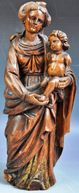 An antique 17th Century Continental religious ecclesiastical hand carved limewood figurine depicting The Madonna & Child Christ. The figure having detailed carvings with draped robes and features raised on a naturalistic base. A good period example. Measures approx; 32cm tall.