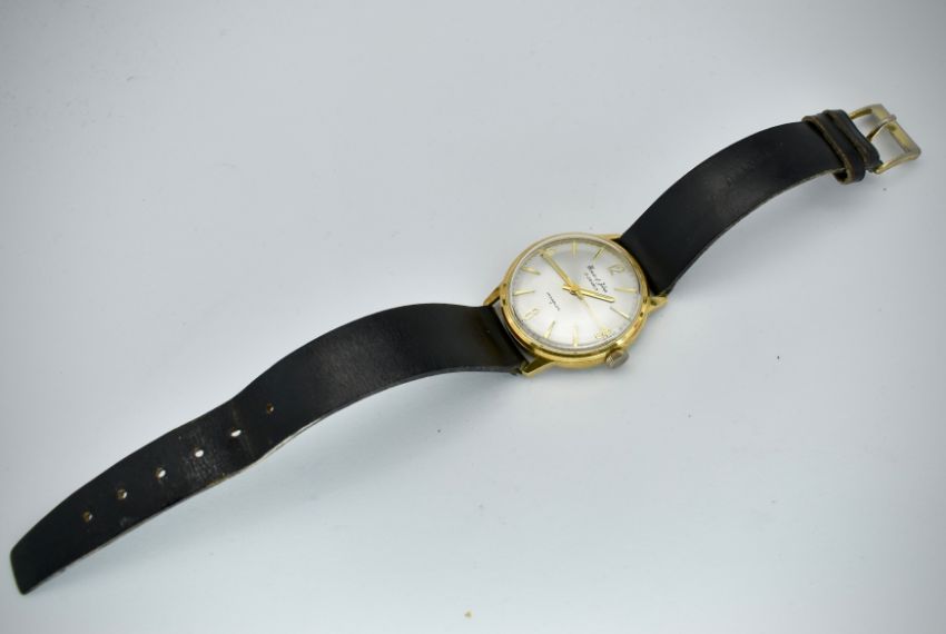 A mid century House of Jobin 17 Jewels Incabloc gentleman's wristwatch / watch. The silvered dial with baton numeral chapter ring with qtr numbers and dagger hands. Inset swiss movement. Reset to a new black leather strap.