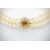 A 9ct gold citrine and cultured pearl necklace. The necklace having three strings of cultured pearls united by 9ct gold, pearl and citrine set clasp. Pearls approx 6mm round. Citrine  approx 13mm x10mm. Marked 9ct. Measures approx 38cms. Weight 61g.