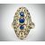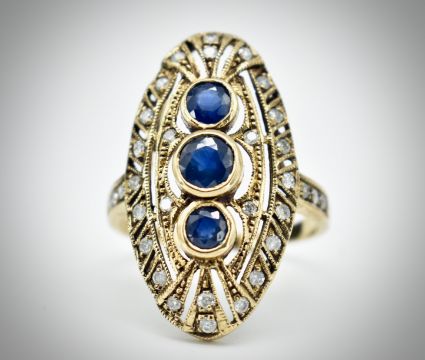 An 9ct yellow gold sapphire and diamond vintage dress ring. The ring of navette form with central round cut sapphires within pierced setting having inset diamonds. The shank stamped 9ct.  Total weight 4.32g / Size Q.5