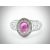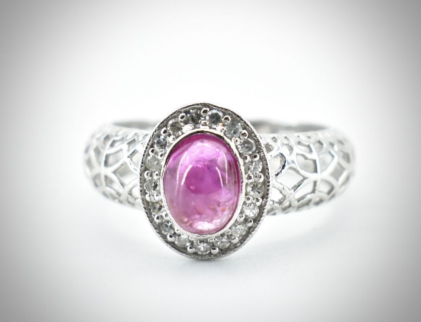 An 18ct white gold ruby and diamond ring. The ring set with a central  ruby cabochon framed by single cut diamonds to a pierced tapering shank. Marked 18K. Tests indicate 18ct gold. Weight 3.08g. Size K.