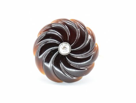 A French 18ct gold and carved agate floral brooch pin. The brooch on the form of a stylised flower head with central bezel set old cut diamond having c clasp and pin verso. French poinçon to clasp. Measures 3.5cms.  Weight 8.92g.