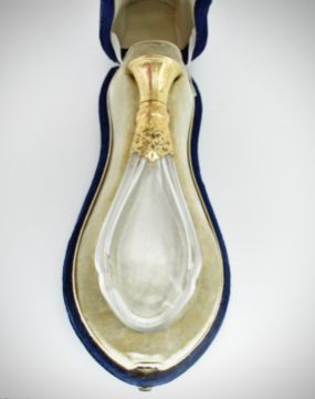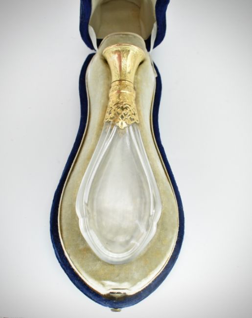 A French gold mounted rock crystal scent bottle. The bottle of scalloped tear drop form having a scrolled and pierced gold mount with scroll engraved monogrammed hinged cover. The cover opening to reveal a stopper / applicator. French poinçon marks eagles head to cover and stopper. Presented in monogrammed fitted case. Measures 10.4cm.