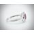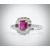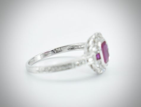 An 18ct white gold ruby and diamond ring. The ring in the Art Deco style being set with a central octagon cut ruby with princess cut ruby accents, having a halo of diamonds with diamond accent shoulders and part etched shank. Marked 750 tests 18ct gold. Weight 2.9g. Size M.5.
