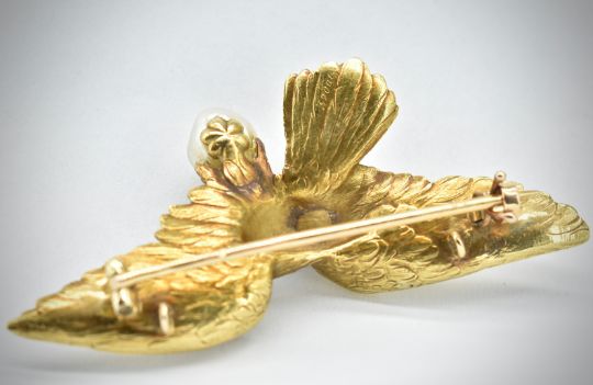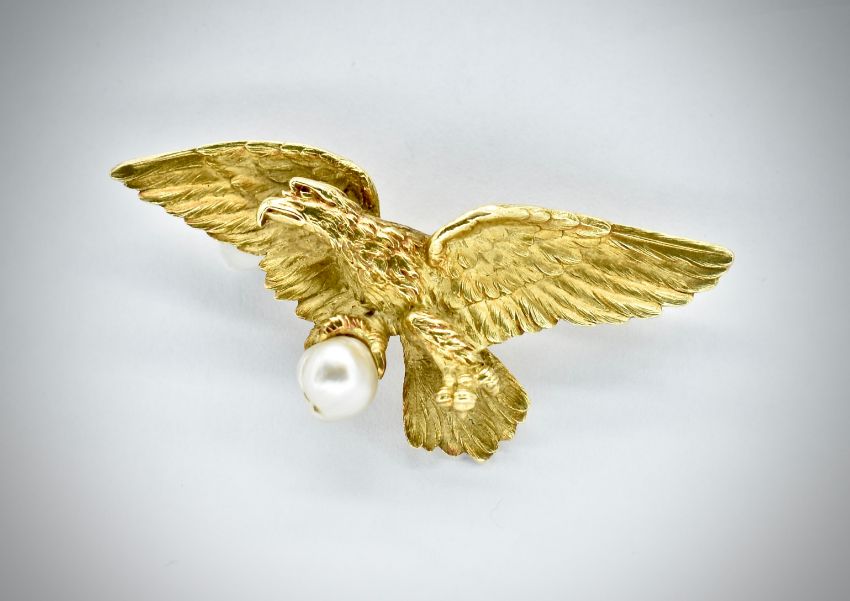 A French 18ct gold and pearl caved figural brooch. The brooch in the form of an eagle, clutching a baroque pearl within its' talons. The brooch having pin, c clasp fastener and bales for safety chain or to enable use as pendant necklace. French poinçon marks to body and pin, numbered 10065. Measures approx 6cms. Weight approx 18.46g