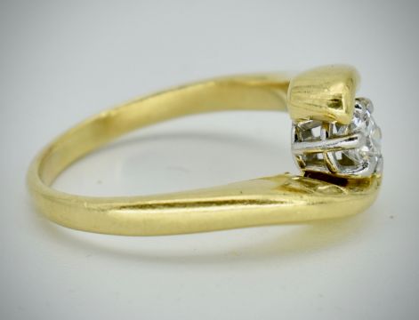 An 18ct gold and diamond solitaire crossover ring. The ring set with a round brilliant cut diamond of approx 0.25cts in a substantial 18ct gold crossover mount. Un marked tests 18ct gold. Weight 4.1g. Size I.