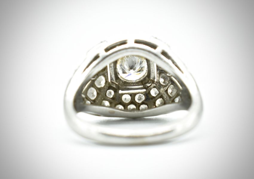 An French platinum and diamond bombe ring. The ring  set with a central round brilliant cut diamond within a domed mount having geometric piercing set with further round brilliant cut diamonds. estimated principle diamond weight 1.02ct.  Estimated colour and clarity H-I  / VS. Estimated total diamond weight 1.7ct. Size P.5. Weight 11.1g
