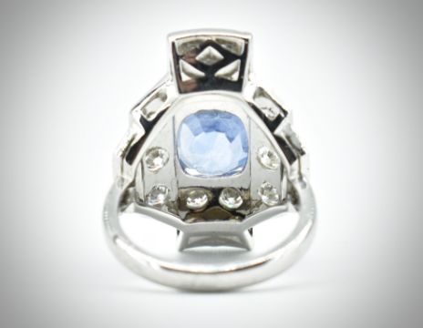 A French 18ct white gold sapphire and diamond ring. The ring in the Art deco style having a central oval lavender blue mixed cut sapphire set to a rectangular plaque, flanked by four round brilliant cut diamonds with a further 12 round brilliant cut diamonds to a terraced mount and plain band.  Estimated diamond colour and clarity  G- H / VS. Sapphire measures approx 9.2mm x 10mm x 6.5mm. Estimated total diamond weight 2.5ct. Size M.5. Weight 9.6g